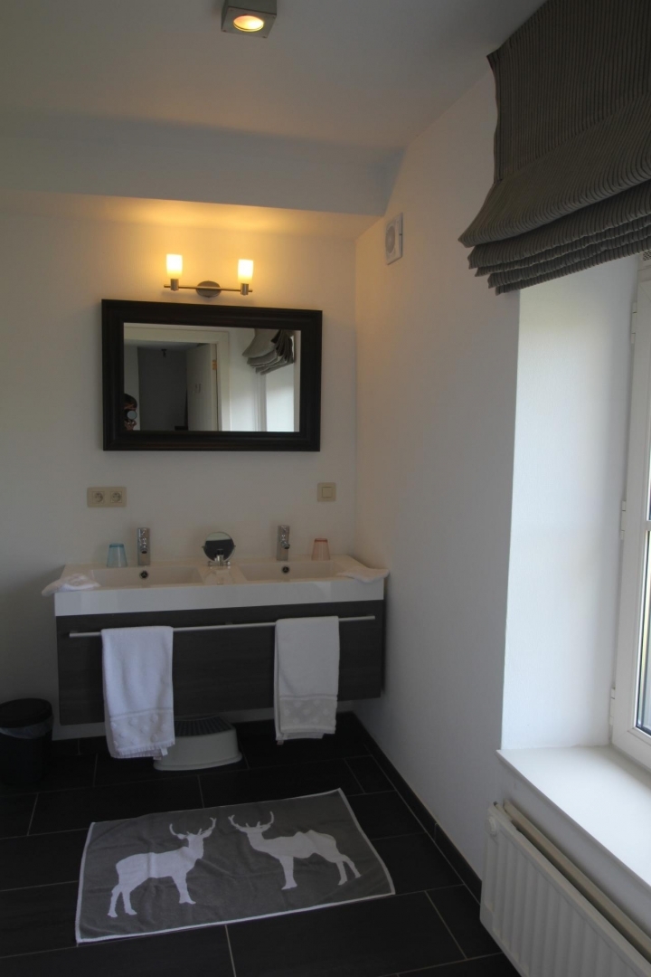 - badkamer met dubbele wastafel, toilet en douche